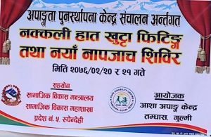 मनोज कार्की गुल्मी, जेठ २० । आशा अपाङग केन्द्र गुल्मीले ५ जनालाई कृत्रिम हात खुट्टा बितरण गरेको छ । प्रदेश नं ५ समाज कल्याण मन्त्रालयको