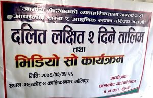 मनोज कार्की गुल्मी, जेठ २६ । गुल्मीको छत्रकोट गाउँपालिकामा दलित लक्षित २ दिने तालिम तथा भिडियो प्रदर्शनी सम्पन्न भएको छ । कार्यक्रममा तालिम मात्र नभइ