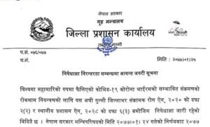 मनु सुनारगुल्मी, बैशाख २६ । कोरोना भाईरसको सम्भावित संक्रमणको रोकथामका लागि जिल्ला प्रशासन कार्यालय गुल्मीले निषेधाज्ञालाई जारी राखेको छ । विश्वव्यापी प्रकोपको रुपमा फैलिएको कोरोना