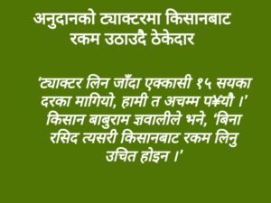 हुमाकान्त पोखरेलगुल्मी, १२ असौज । गुल्मीको रुरुक्षेत्र गाउँपालिकामा अनुदानबाट प्रदान गरिने ट्याक्टरबाट ठेकेदारले रकम उठाएको खुलेको छ । रुरुक्षेत्र गाउँपालिकाको आर्थिक बर्ष २०७६/७७ को कार्यक्रमअनुसार
